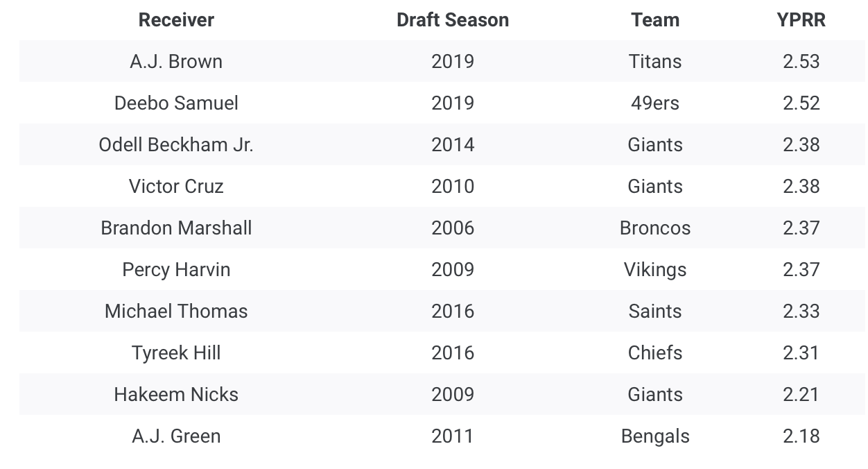 PFF noted that Brown averages the most yards per route of any wide receiver over the first three years of a career.