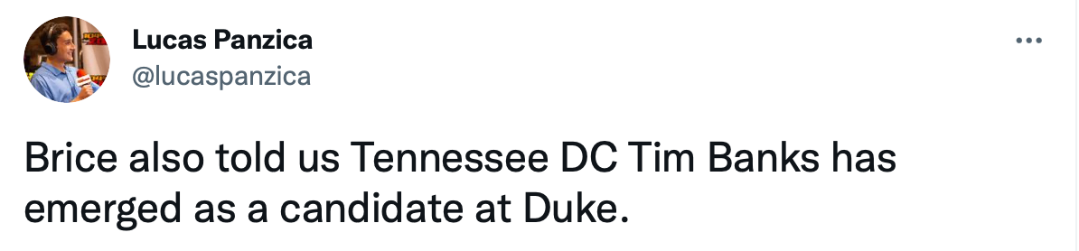 Football Scoop's John Brice reported on Monday, during an appearance on 104.5 The Zone in Nashville, that Vols defensive coordinator Tim Banks is very much in the mix for the Duke job.
