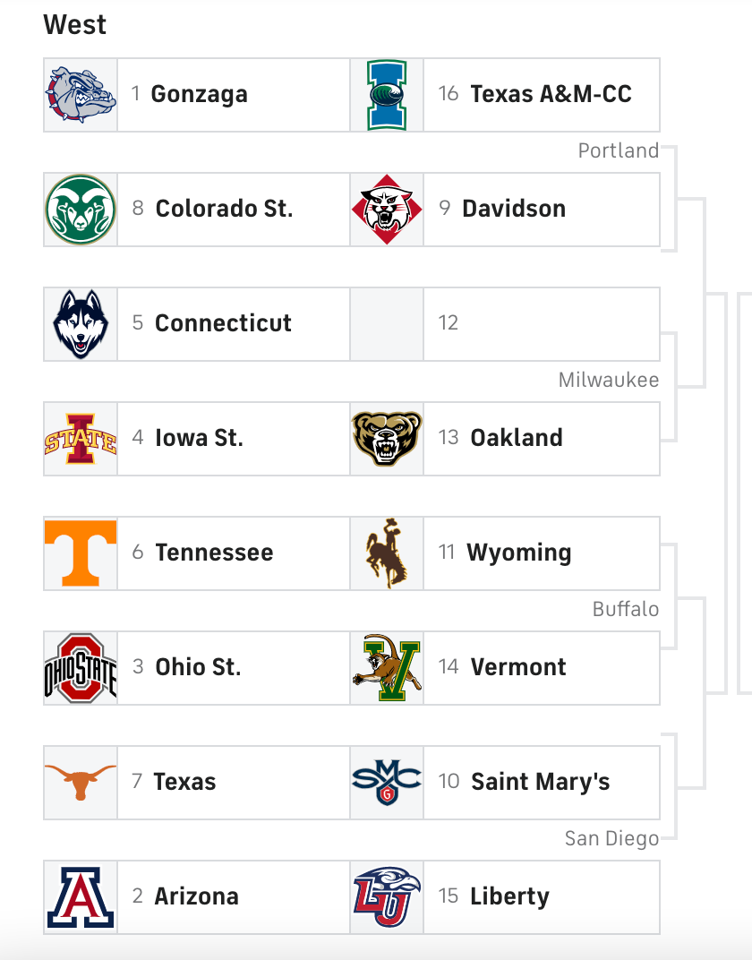 Palm currently has the Tennessee Vols as a No. 6 seed in the West Region taking on No. 11 seeded Wyoming.