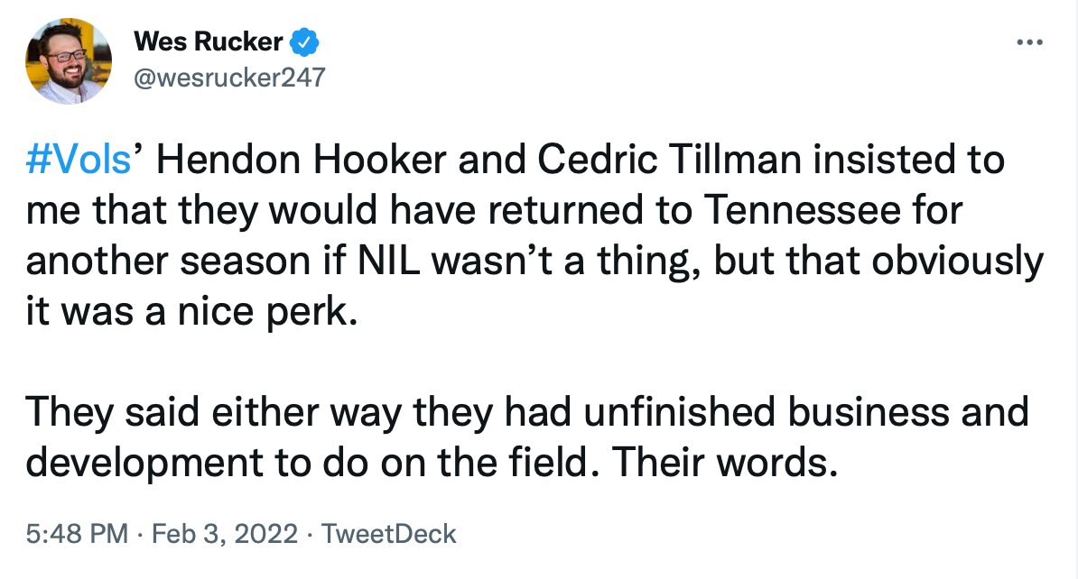 Hooker and Tillman each made it clear on Thursday that NIL deals were not their main motivation for returning to Tennessee. Instead, their main motivation is "unfinished business" and continued development.