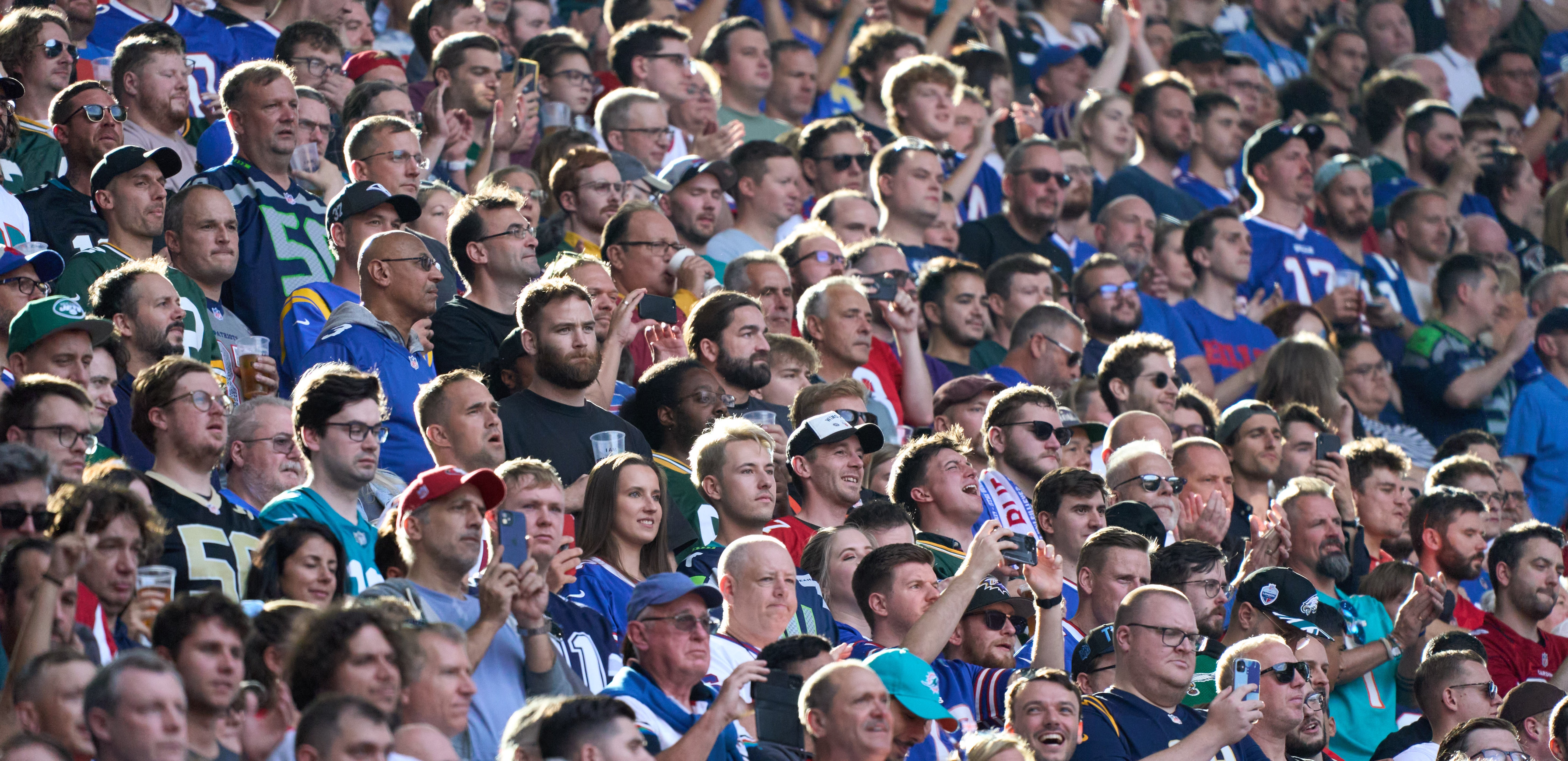 In this photo, taken last week when the Jaguars played the Bills in London, I can count up to 13 different NFL teams being represented. Majority of the fans in the picture are wearing the threads of a team not playing in the game.