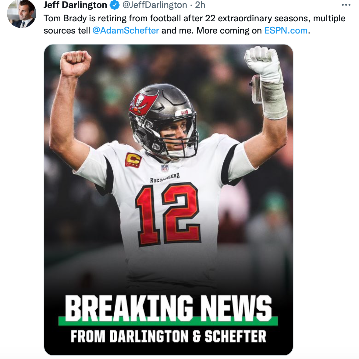 On Saturday, ESPN's Adam Schefter and Jeff Darlington reported that legendary quarterback Tom Brady is retiring after 22 seasons. Darlington tweeted that reported at 2:29 PM ET. At 3:33 PM ET, Schefter tweeted a message from Brady's agent, saying his client had not made any retirement plans yet. At 4:09 PM ET, Tampa Bay Times […]