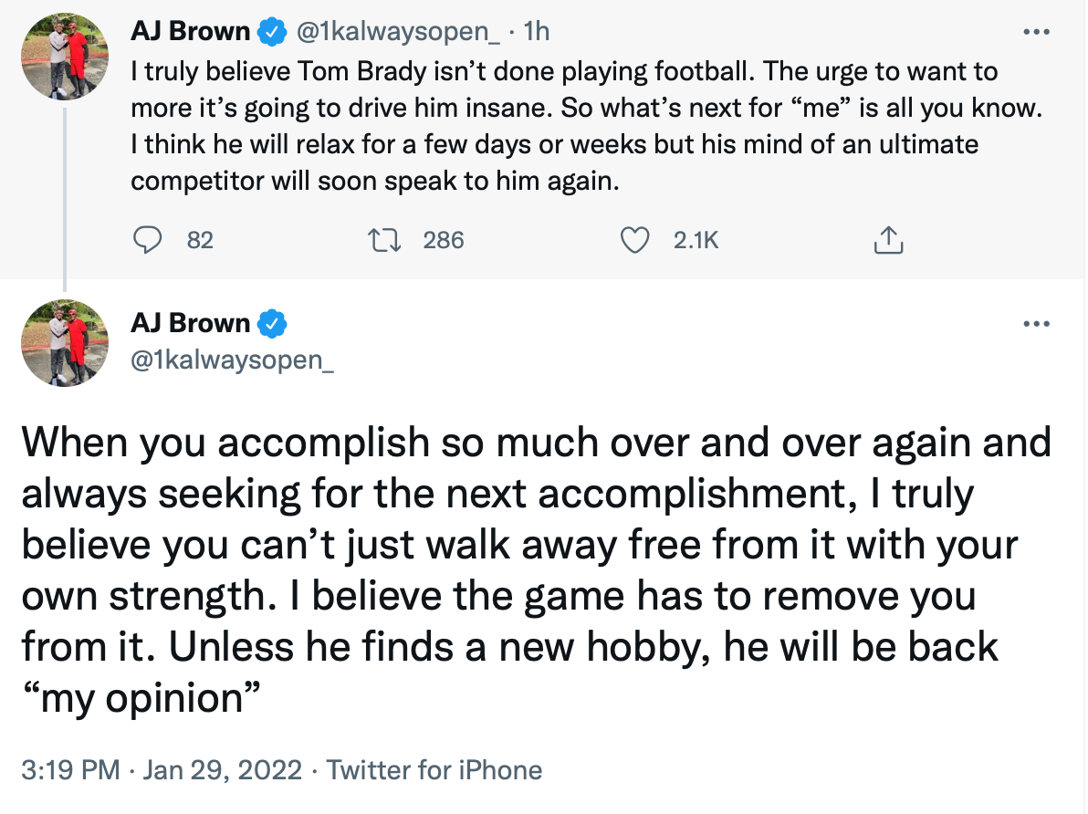 Everyone except Titans wide receiver AJ Brown, who was never really buying into the Brady retirement report.