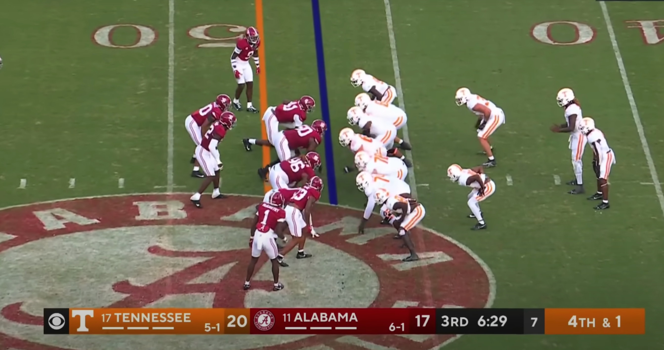 On fourth-and-one (with the ball near midfield), the Vols lined up in a shotgun formation and handed the ball to running back Dylan Sampson, the smallest of Tennessee's three primary running backs. Sampson was unable to pick up the first down due to the penetration of Alabama's defense.