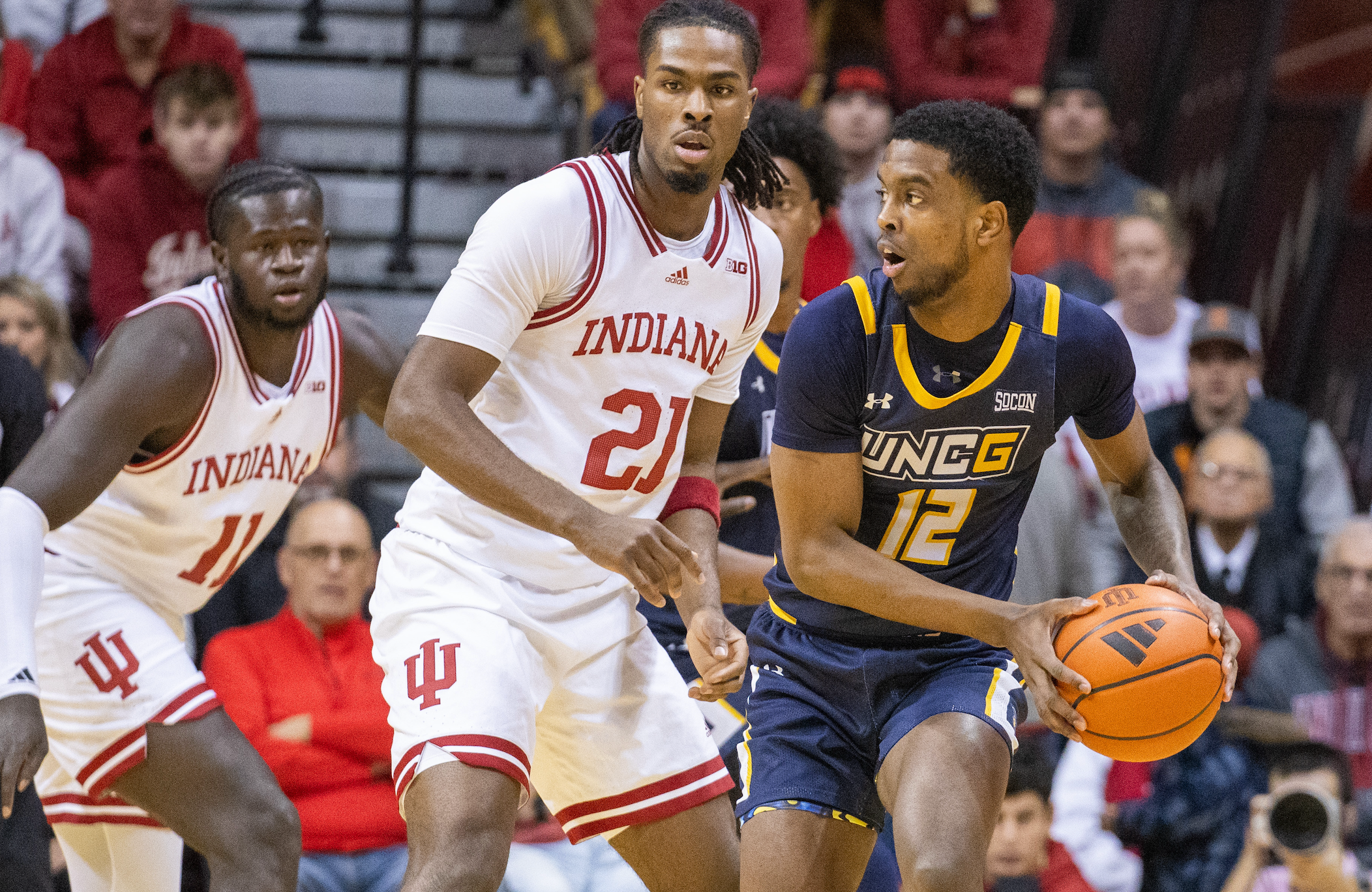 Nov 21, 2024; Bloomington, Indiana, USA; UNC-Greensboro Spartans guard Donovan Atwell (12) holds the ball while Indiana Hoosiers forward Mackenzie Mgbako (21) defends in the first half at Simon Skjodt Assembly Hall. Mandatory Credit: Trevor Ruszkowski-Imagn Images