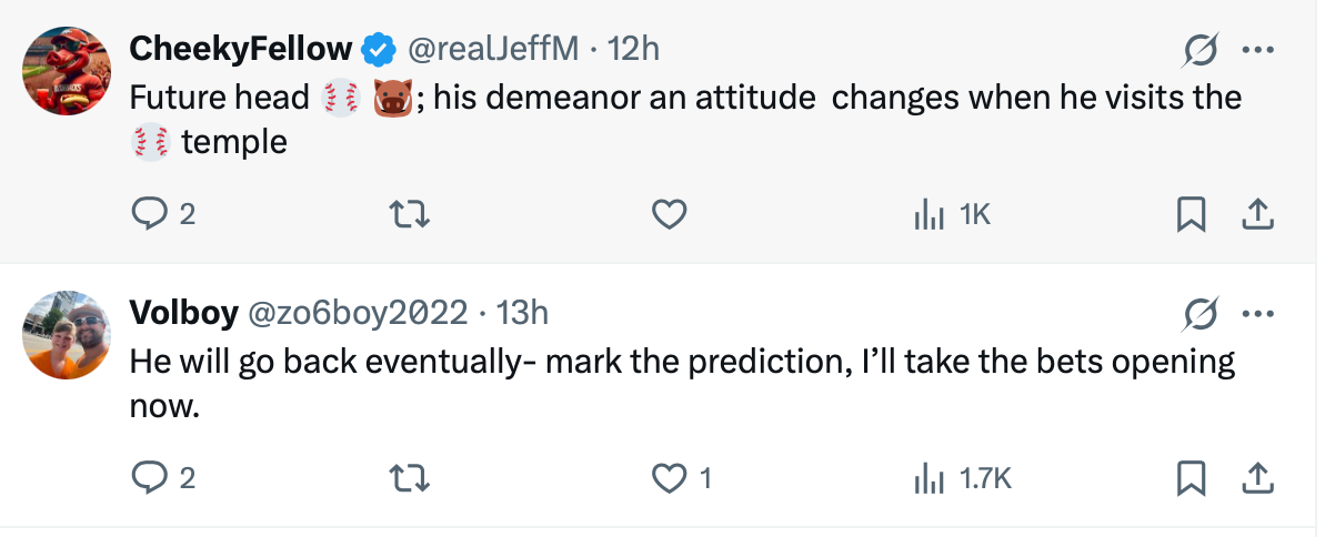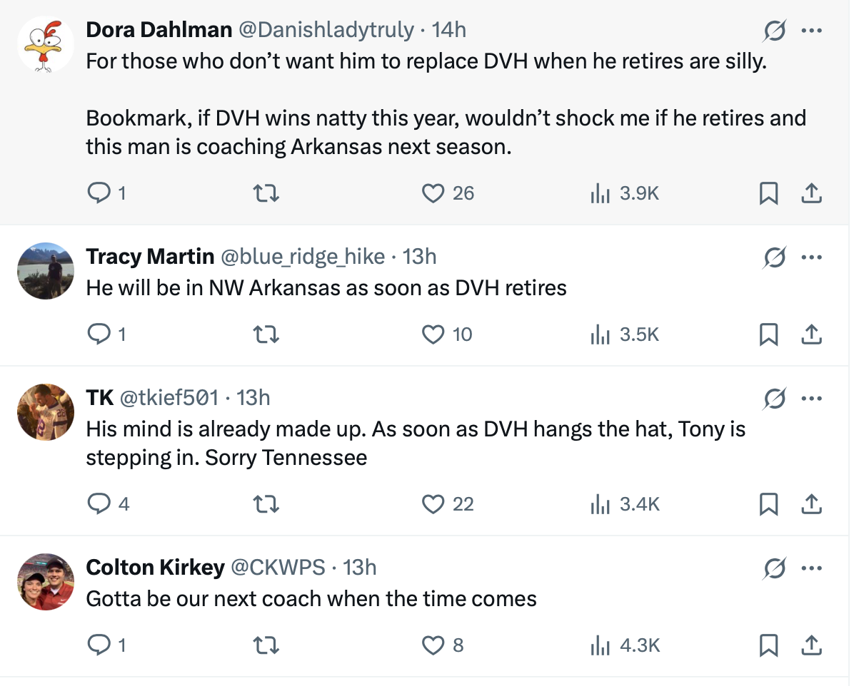 Some college baseball fans interpreted Vitello's comments (especially the "it's a good place to work" comment) as a sign that the Tennessee head coach will be interested in the Arkansas coaching job when Van Horn retires in the future.