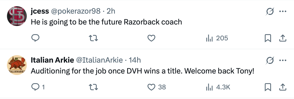 Whether or not Vitello is the head coach at Arkansas one day is anyone's guess. You never say never in the unpredictable world of college sports. But I don't believe the emotion we saw on Sunday from Vitello was because he deeply misses Fayetteville. Instead, I think it was a genuine appreciation for the time he spent on Van Horn's staff, and the growth he enjoyed as coach during that time.