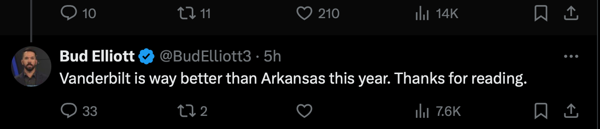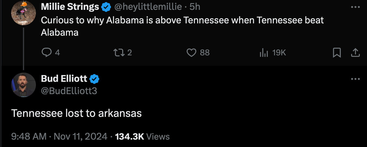 Elliott also suggested that Alabama's loss to Vanderbilt wasn't nearly as bad as Tennessee's loss to Arkansas, even though Vanderbilt has the same number of losses as Arkansas (and let's not forget that Vanderbilt lost to Georgia State!).