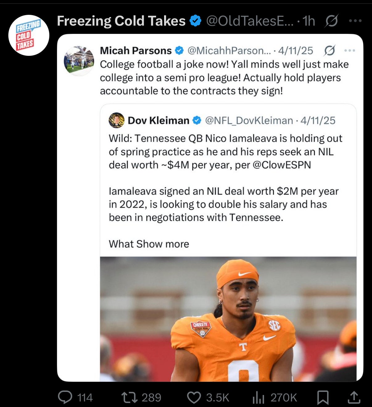 “College football a joke now,” wrote Parsons. “Y’all [might as] well just make college into a semi-pro league! Actually hold players accountable to the contracts they sign!”