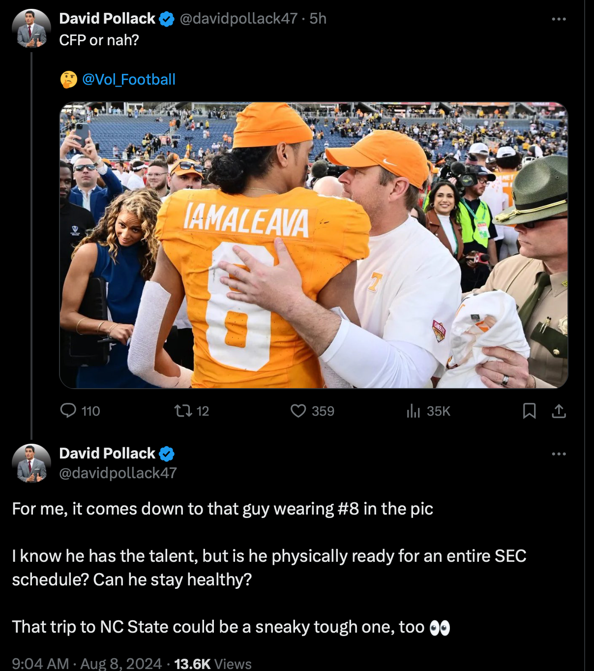 Pollack sent a tweet on Thursday asking fans if they think Tennessee can reach the College Football Playoff.