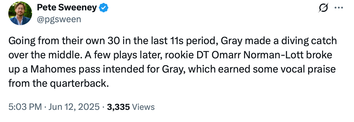 The rookie defensive lineman, who was selected by the Chiefs in the second round of the 2025 NFL Draft, earned some praise from Patrick Mahomes after knocking down a pass from the superstar quarterback on Thursday.