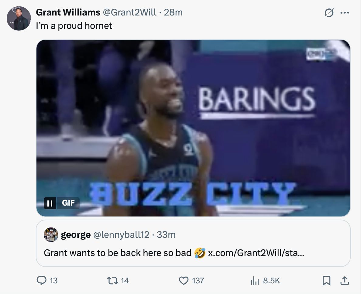 Williams quickly replied to a fan who suggested that he wants to return to Boston by tweeting, "I'm a proud Hornet".