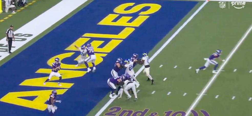 Late in the fourth quarter, with the Rams holding on to an eight point lead against the Minnesota Vikings, Young sacked quarterback Sam Darnold in the end zone for a safety.