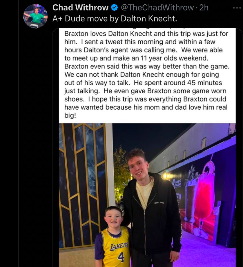 Knecht heard about the family's situation and his agent got in touch with the family to meet up while they were still in Los Angeles. According to the Facebook post, Knecht spent around 45 minutes with the family and even gave the young fan pair of game-worn shoes.