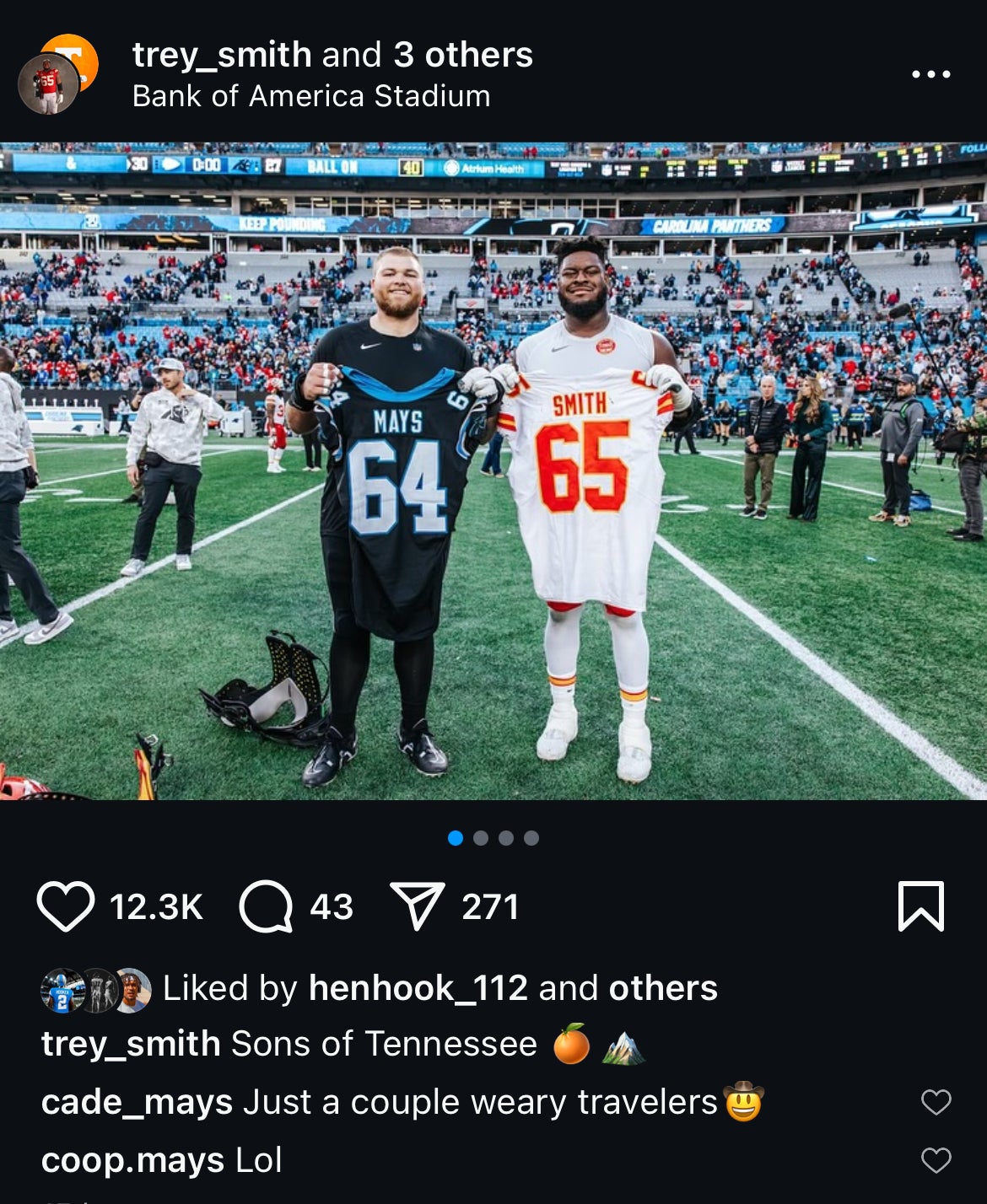 A pair of former Tennessee Vols teammates linked up in Charlotte last Sunday for a jersey swap after the Kansas City Chiefs' narrow win against the Carolina Panthers. Chiefs offensive lineman Trey Smith and Panthers offensive lineman Cade Mays met up on the field to exchange jerseys just after Kansas City kicked a field goal […]