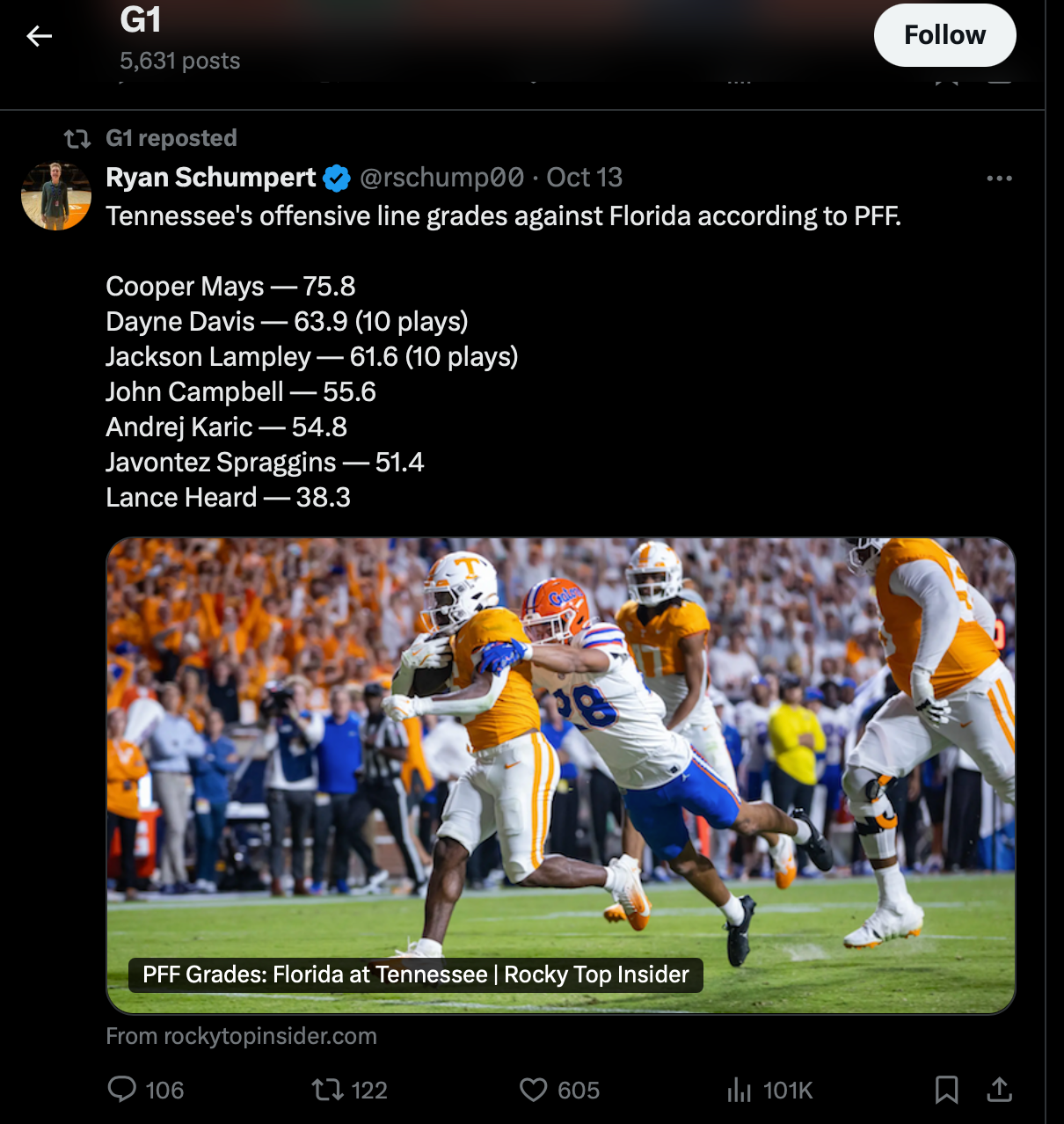 I mean, why else would a Kentucky offensive linemen retweet something that highlights a poor PFF grade for the player that happened to replace him at Tennessee? Especially after Mincey spent a chunk of time in the offseason throwing shade at the Vols.
