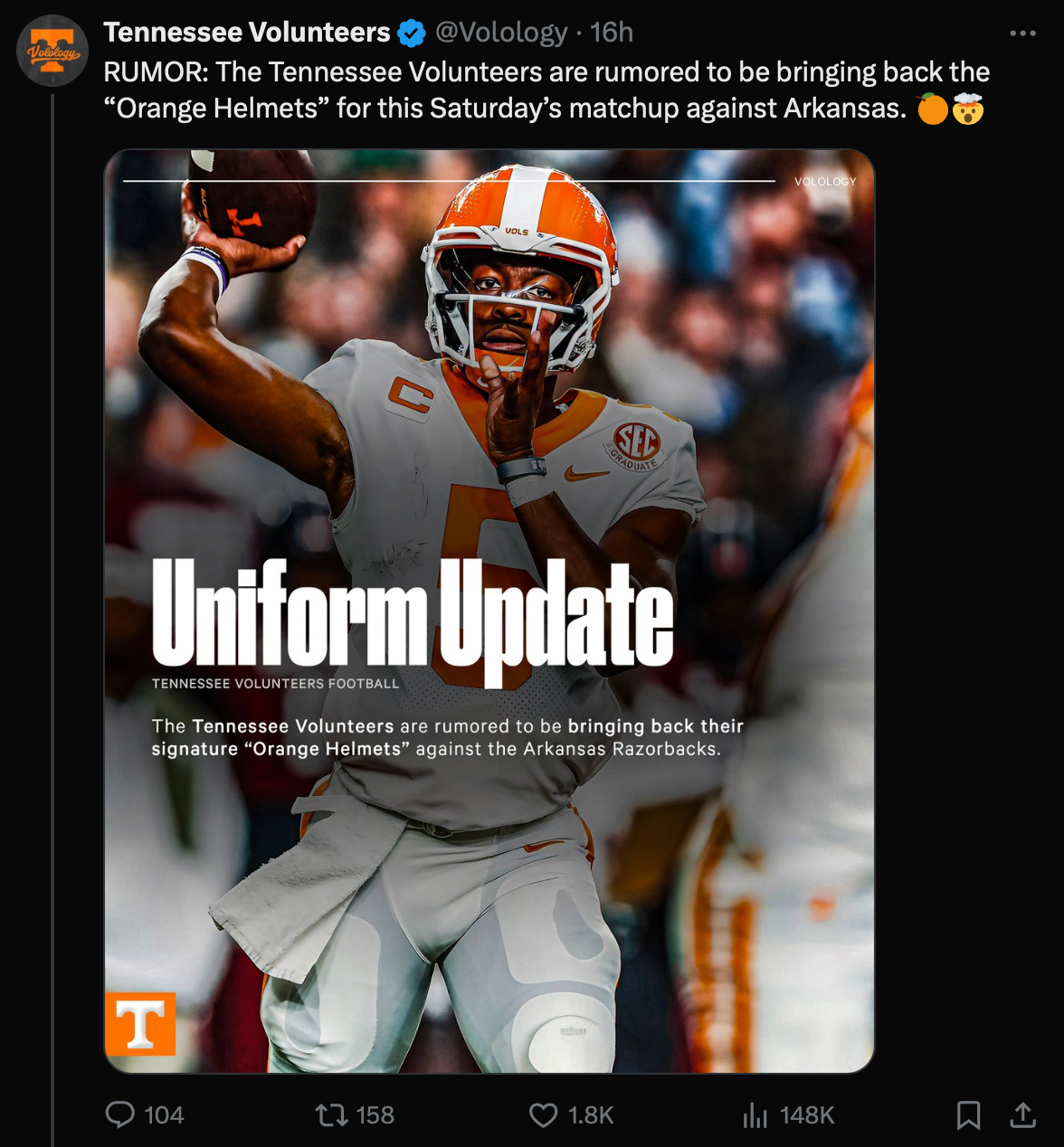 Over the last couple of days, multiple social media posts popped up that suggested that Tennessee might wear orange helmets against the Arkansas Razorbacks on Saturday night.