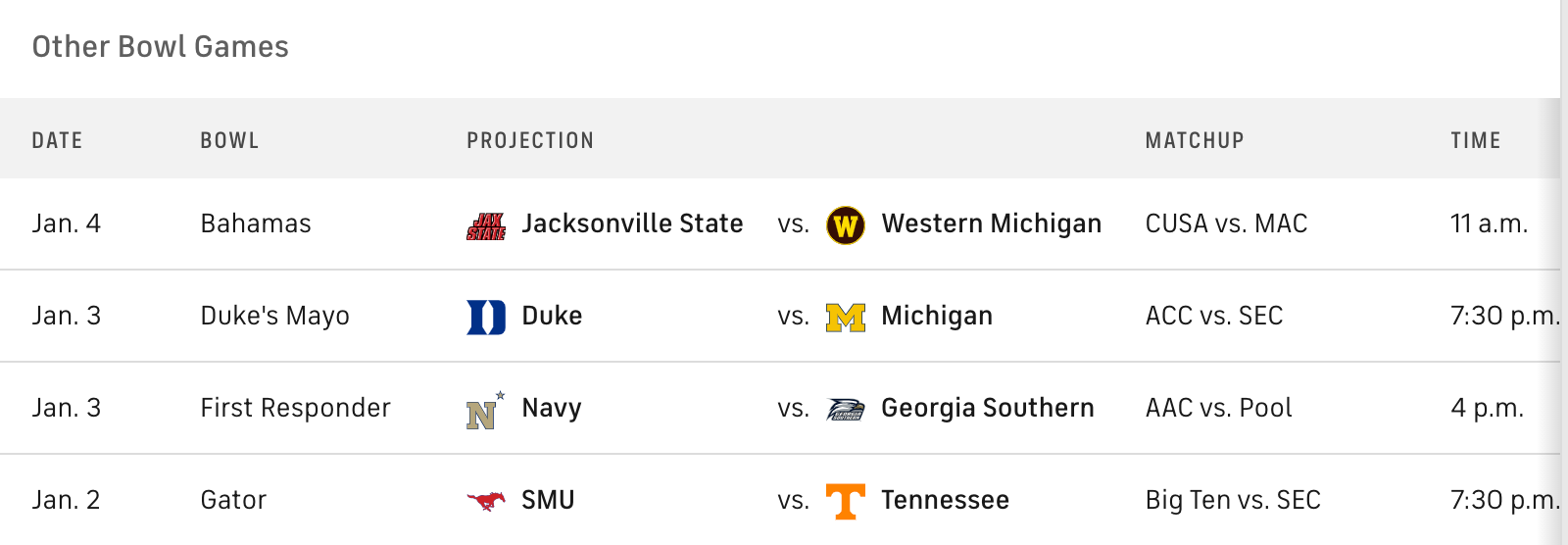 Despite the fact that Tennessee is 6-1 with a win against Alabama, Palm has the Vols playing SMU in the Gator Bowl on January 2.