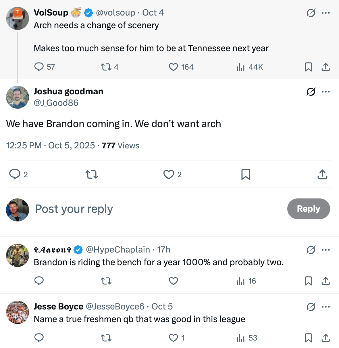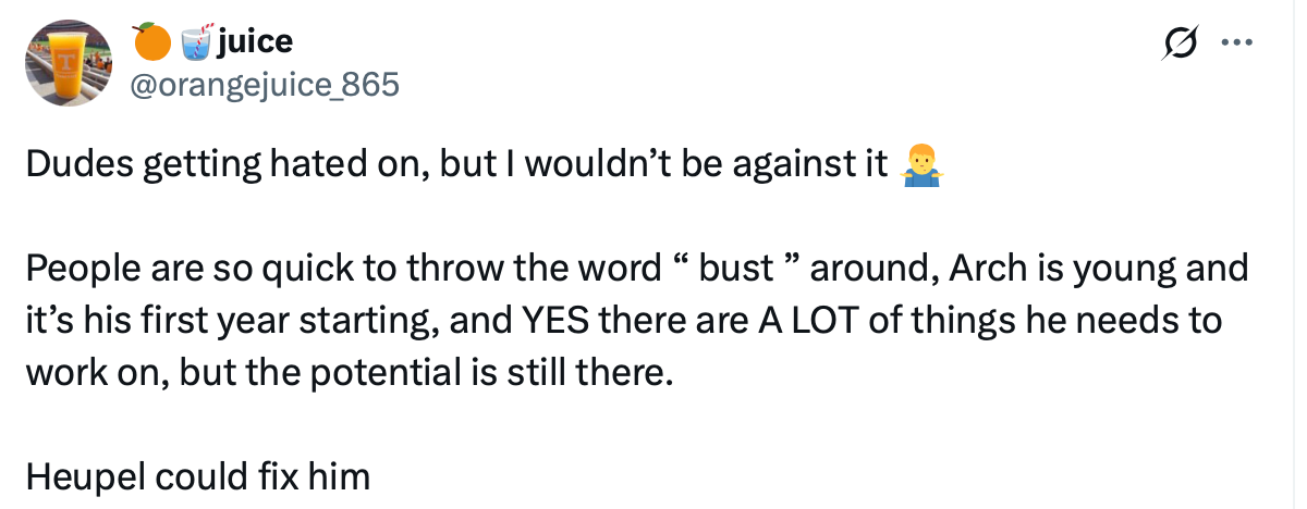 Several social media users have suggested that Arch should consider transferring to Tennessee to play for Josh Heupel in 2026.