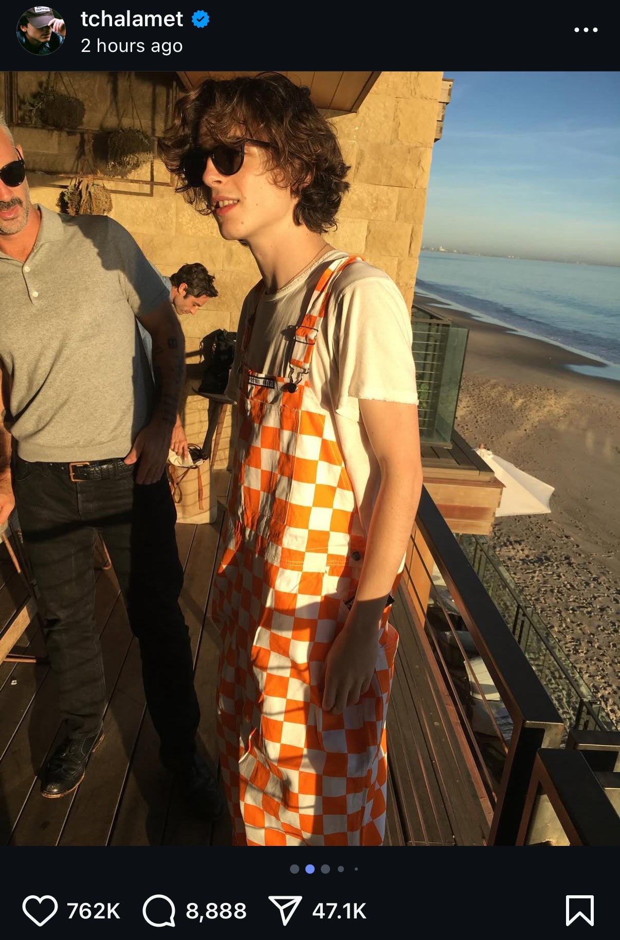 Chalamet posted a photo of himself on Instagram in orange and white checkerboard overalls (which are regularly seen at Tennessee sporting events and in Vols gift shops).