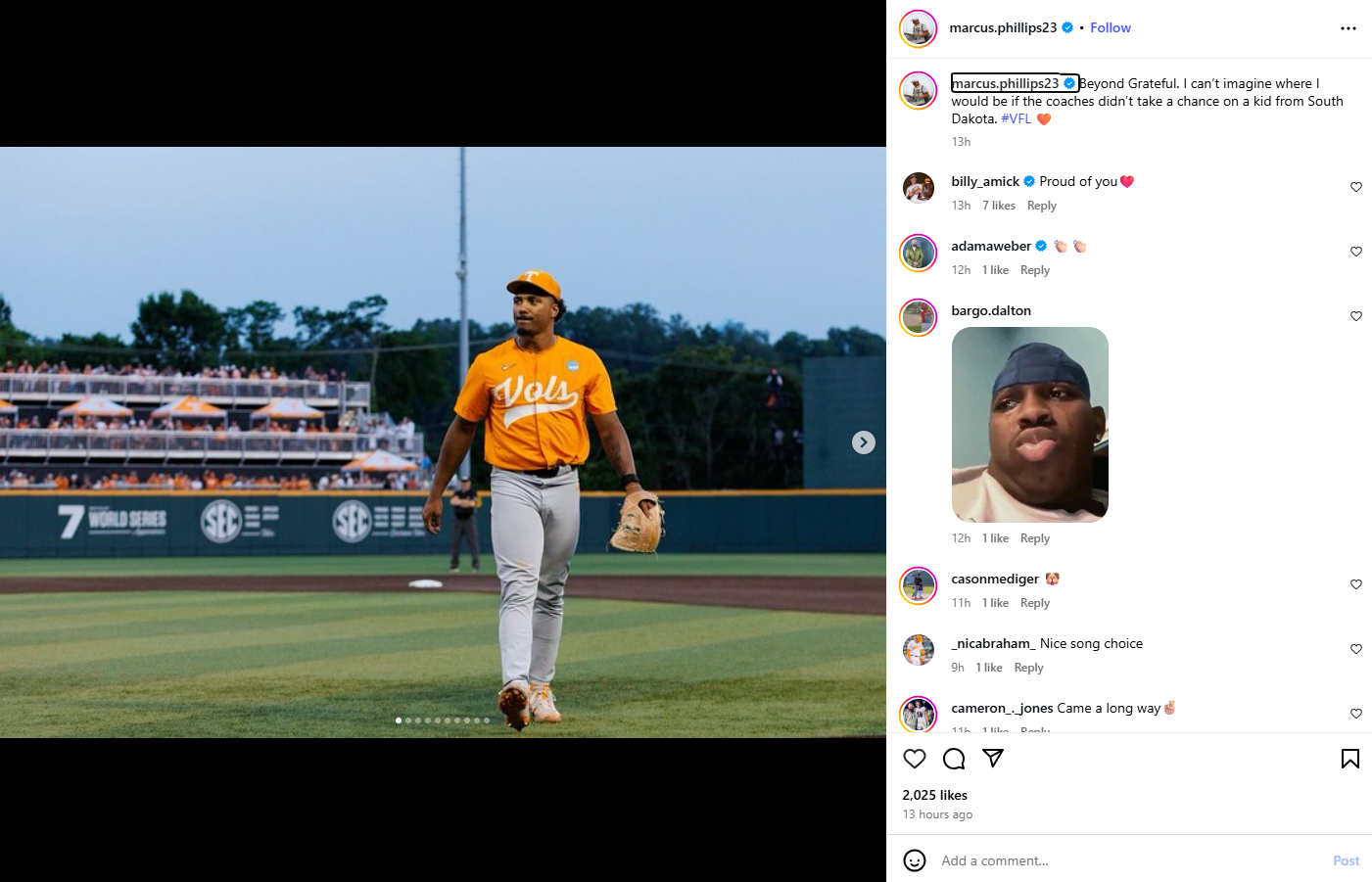 Phillips put up a post on Monday night thanking Tennessee fans, saying "[b]eyond Grateful. I can't imagine where I would be in the coaches didn't take a chance on a kid from South Dakota. #VFL"