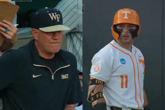 Wake Forest baseball coach appears to direct nasty words at Tennessee Vols’ Andrew Fischer right before he launches a home run