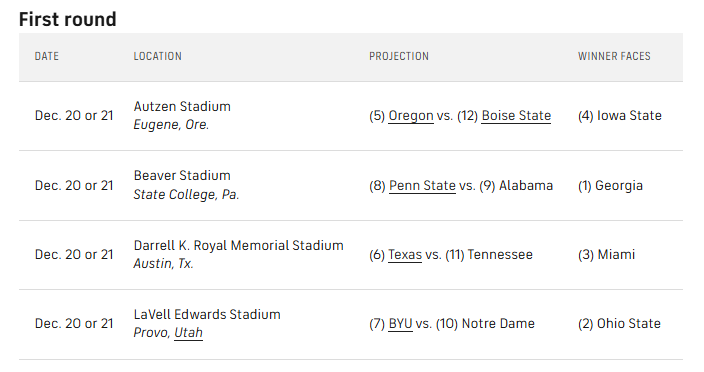 Palm, who added the Vols into his latest projection on Sunday after they were conspicuously absent for weeks before, has the Vols as the 11 seed and traveling to 6 seeded Texas in the on-campus first round of the playoff.