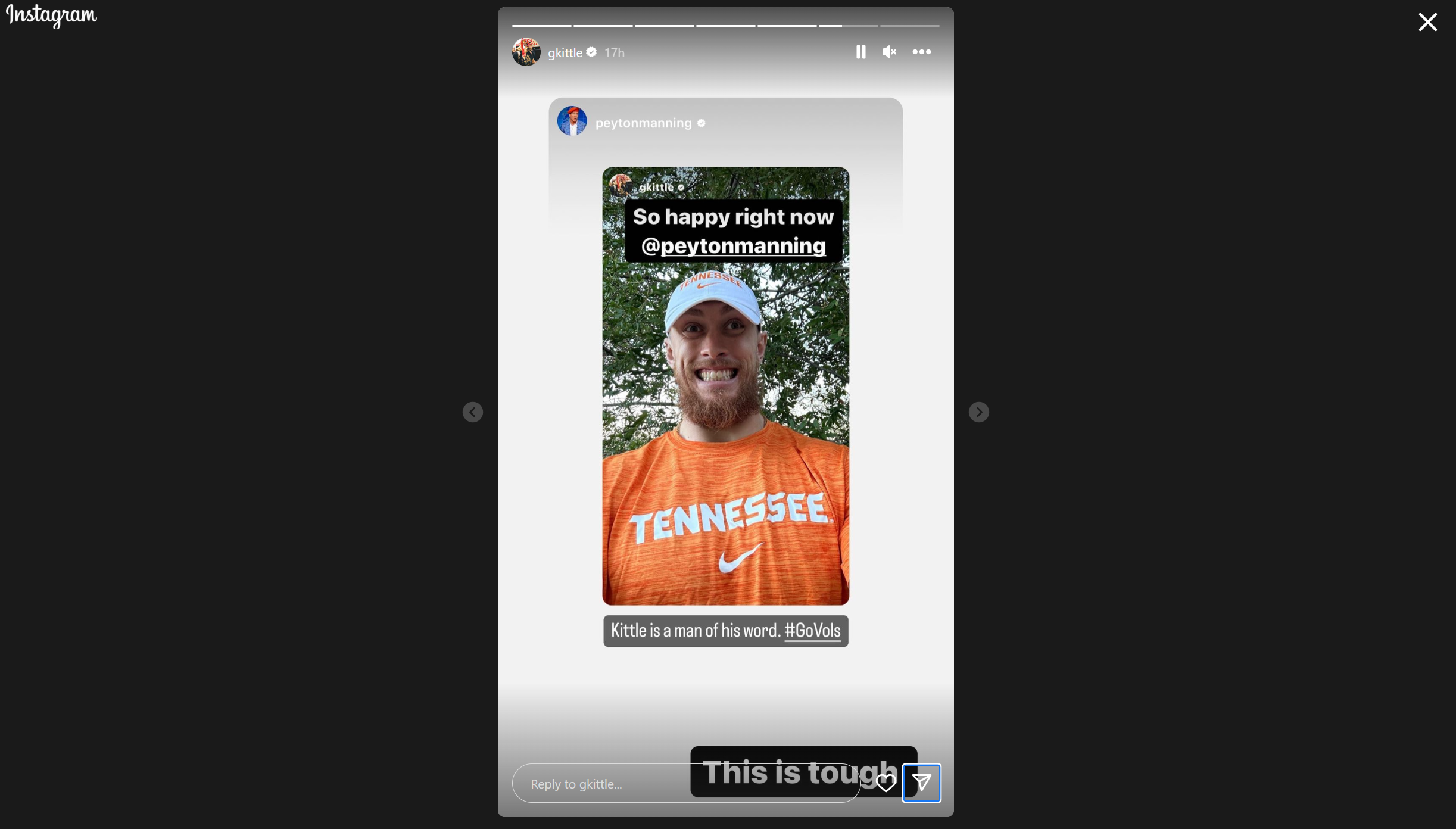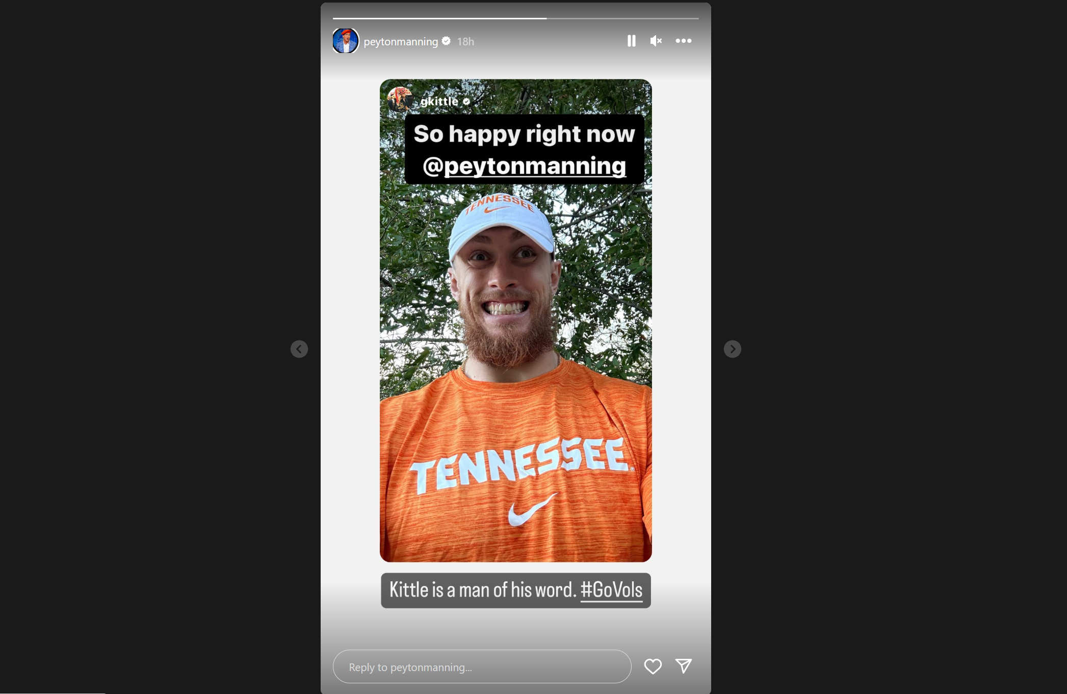 Now, the NFL standout is eating a plate of orange-and-white-colored crow at the hands of Iamaleava and the Volunteers.  And Peyton Manning showed his appreciate of Kittle's post shortly after he put it up. Kittle responded acknowledging the forced nature of his participation in the aftermath of the bet.