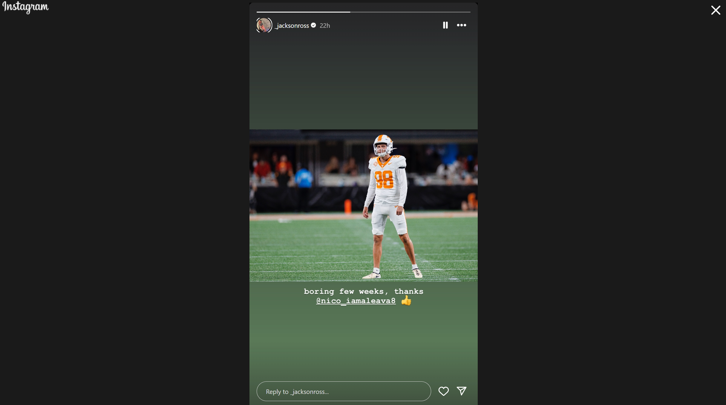 As such, Ross hasn't had to trot onto the field much and boot the ball away.  He's only had to punt one time in each game this year. And to celebrate that objectively good fact for the Vols, Ross took to Instagram to make a tongue-in-cheek post directed at his quarterback for being so good.