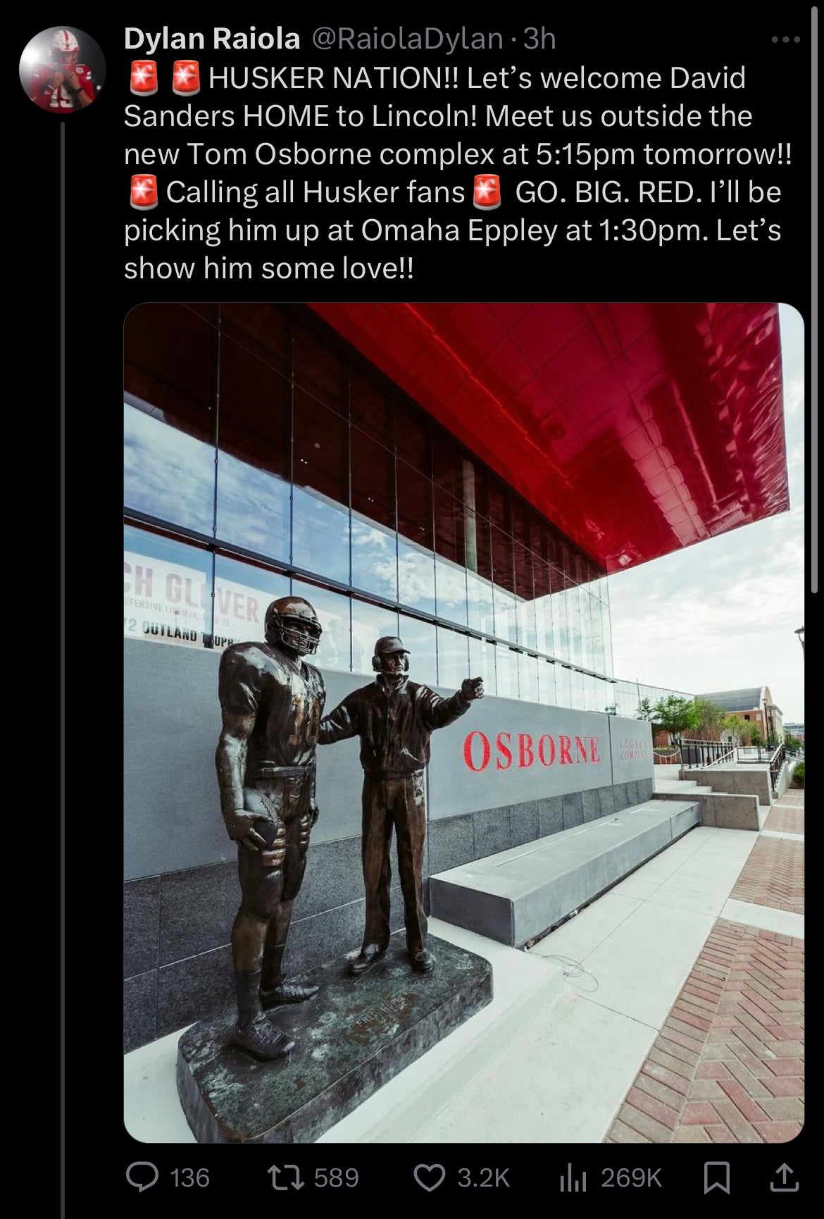 On Thursday evening, Raiola, who committed to Nebraska last December, sent a tweet that asked fans to show up to welcome Sanders when he arrives on campus in Lincoln on Friday evening.