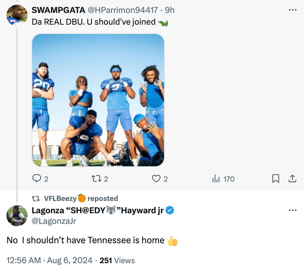 Hayward quickly responded to the Gators fan by saying "No I shouldn't have, Tennessee is home".