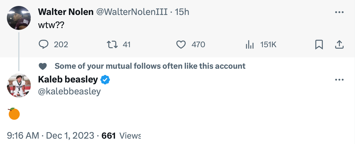 2024 Vols commits Boo Carter and Kaleb Beasley tweeted at Nolen this week that he should transfer to Tennessee.