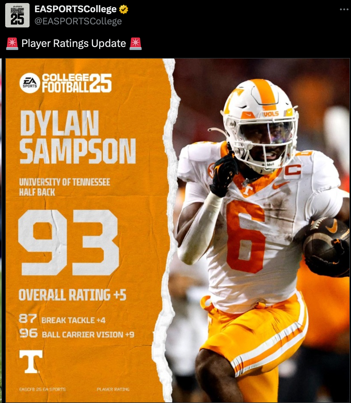 Tennessee Vols RB Dylan Sampson's ratings get adjusted on EA Sports College Football video game