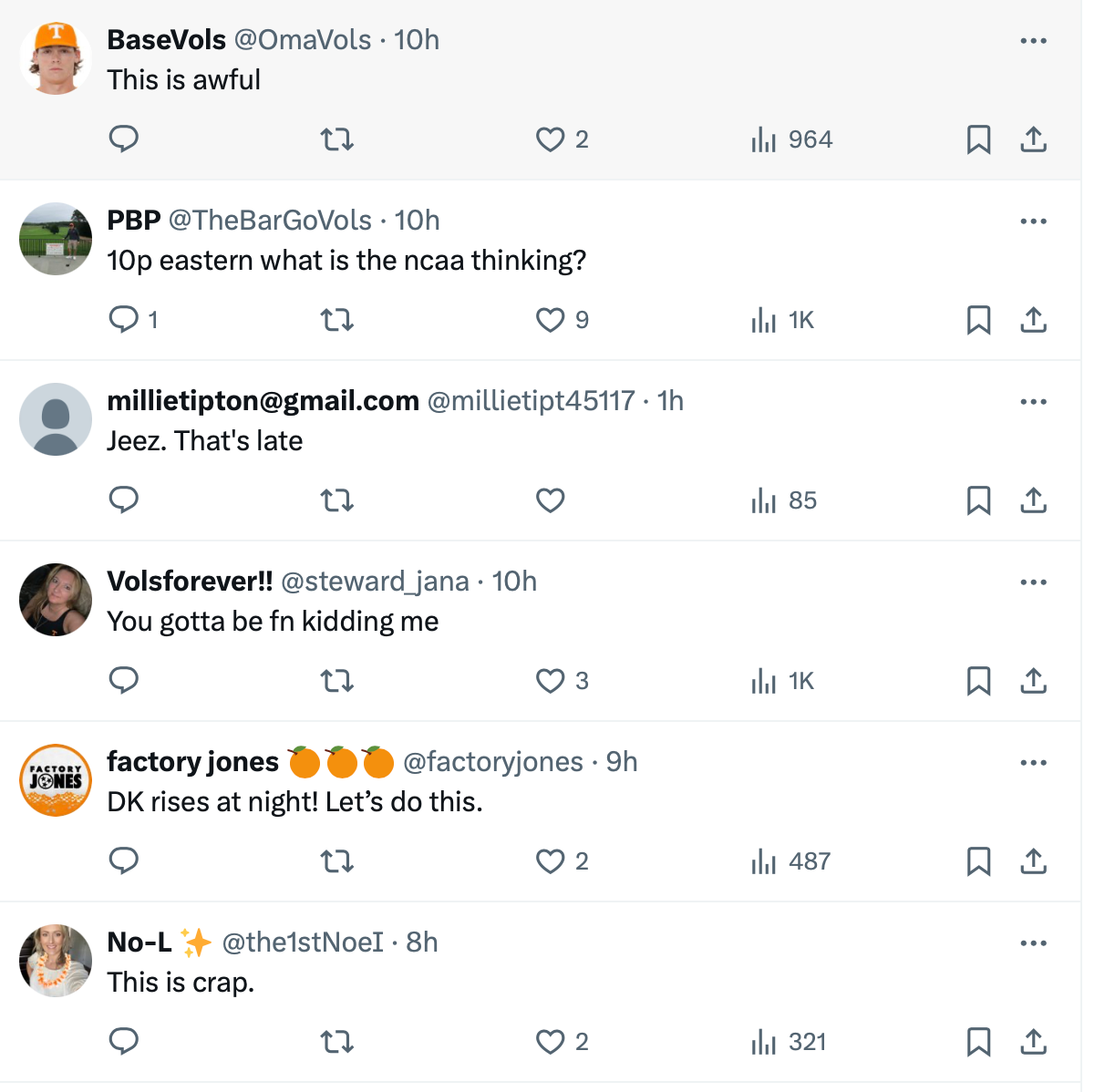 Here are some of the reactions to the late game time for the Vols.