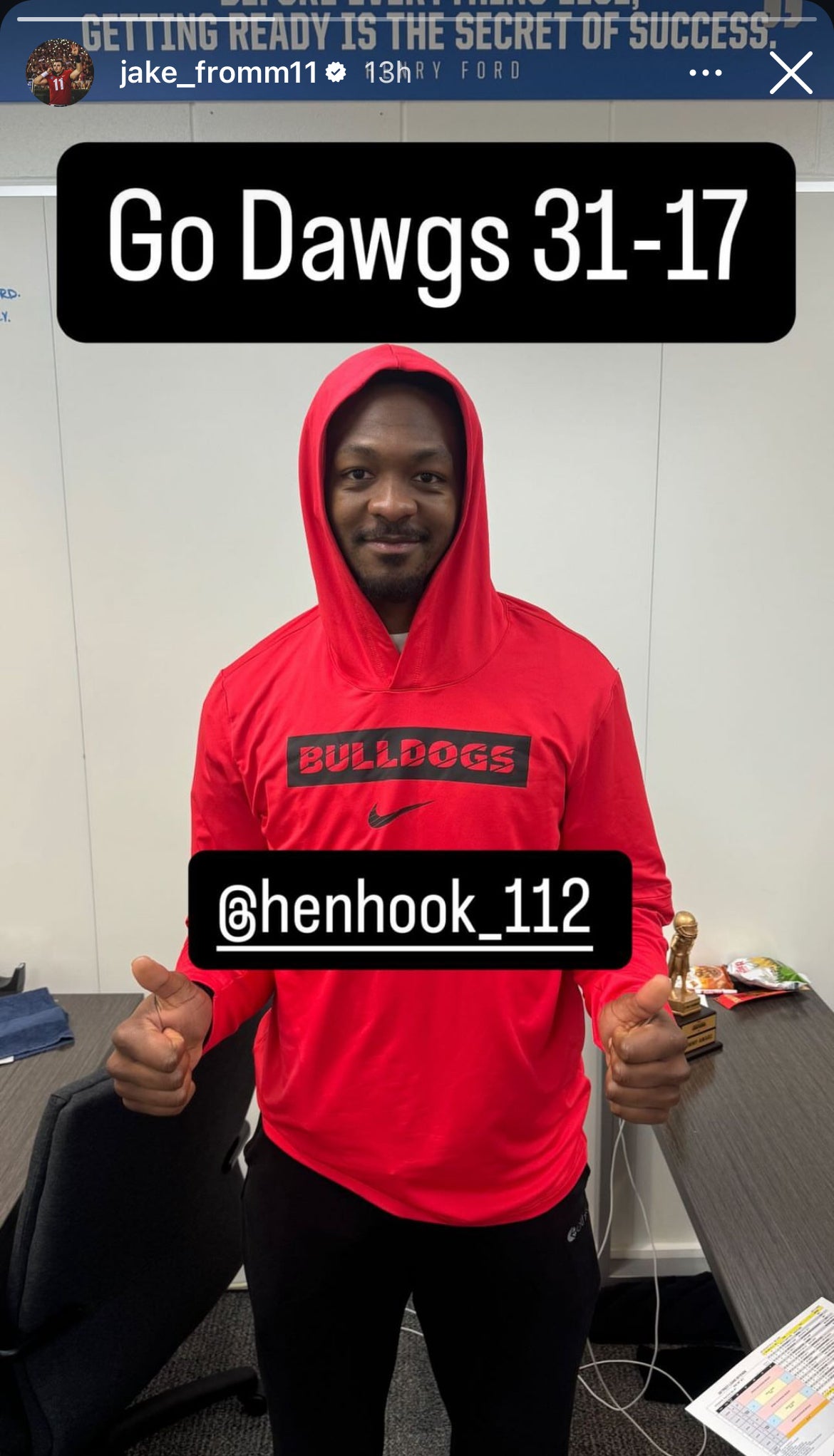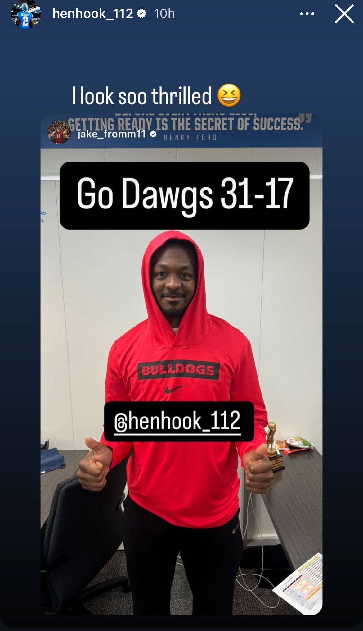 Lions quarterback Jake Fromm, a former Georgia standout, posted a photo on his Instagram story of Hooker in a Bulldogs hoodie on Wednesday evening.