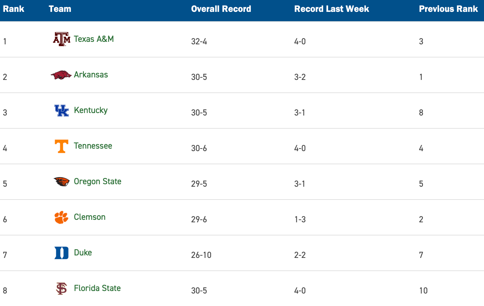 Tennessee and Kentucky, by the way, will play a huge series in Lexington this weekend. If the Vols can win that series, they should easily pass the Wildcats in next week's rankings.