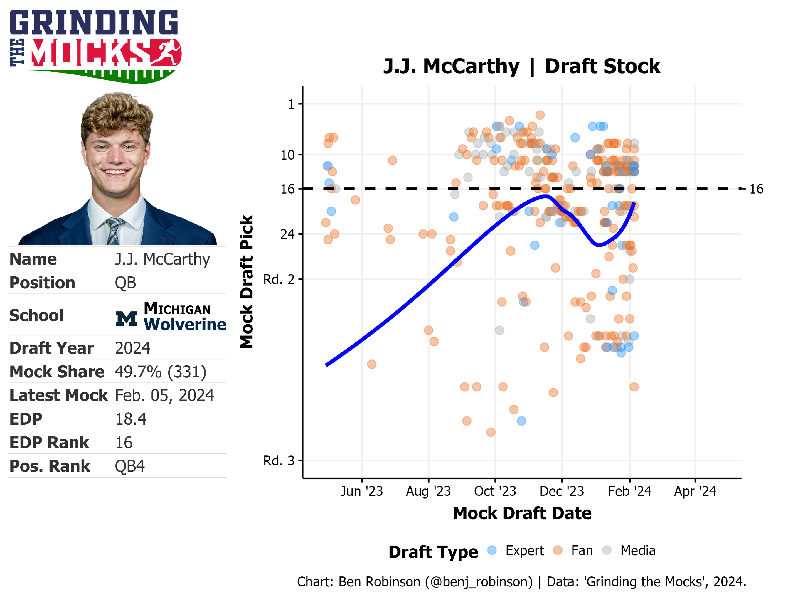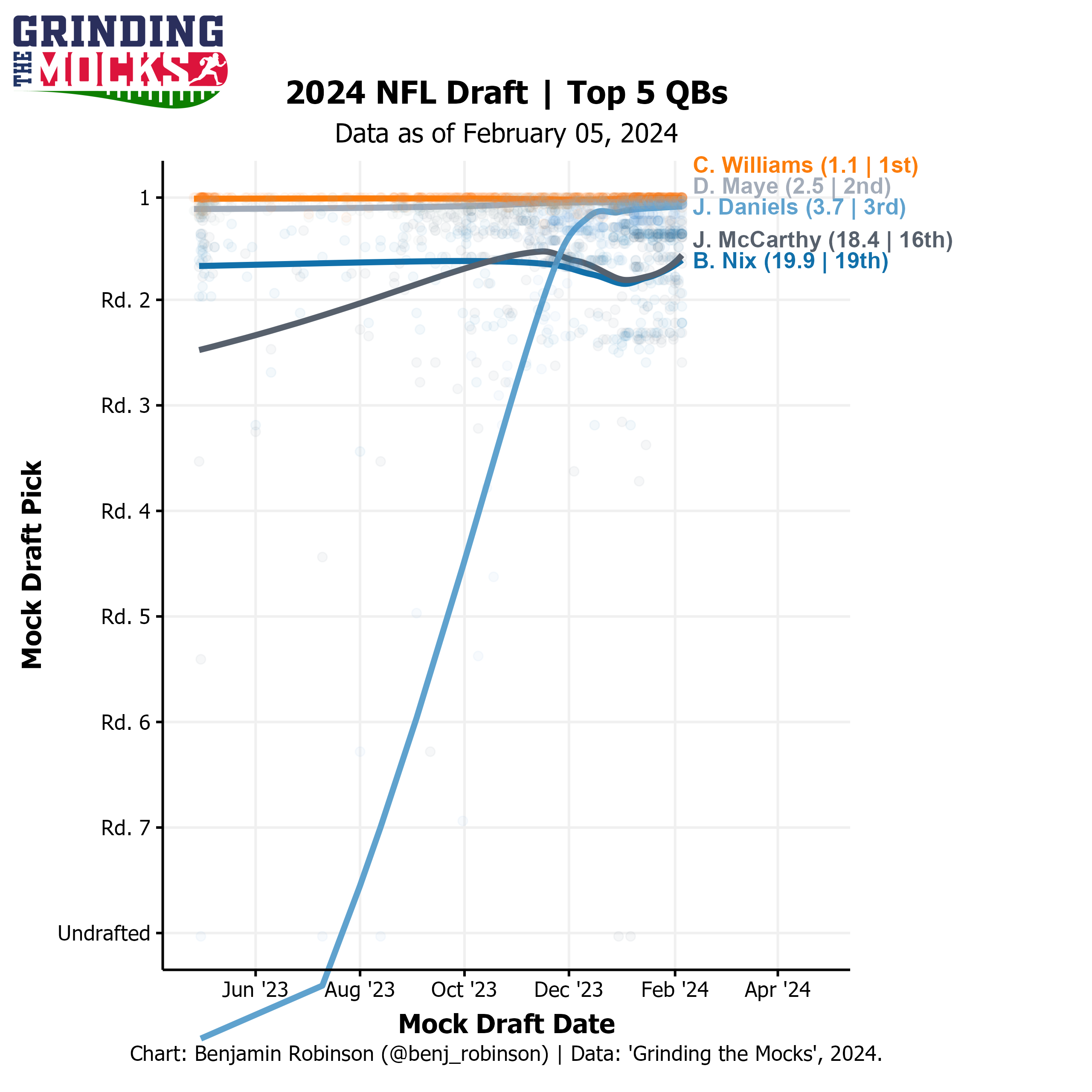 The NFL mock draft tool, Grinding the Mocks (created by former Football Outsiders' Benjamin Robinson), tracks every mock draft on the internet to help us visualize current prospect consensus. As you can see below, J.J. McCarthy saw a slight dip to his stock in January, but he's been quickly rising in recent weeks.