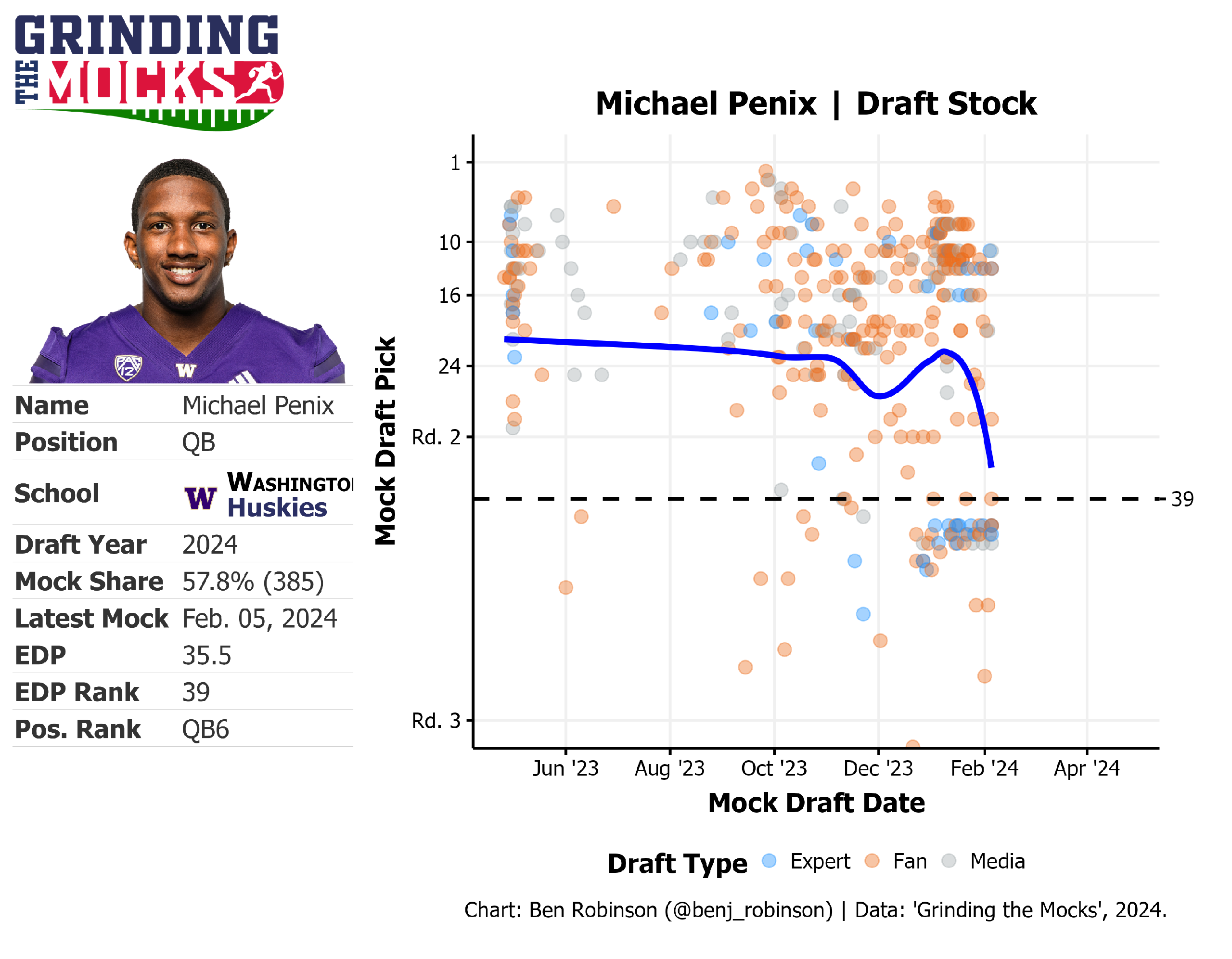 The one notable name who is absent from the first round projections at quarterback is Michael Penix Jr. of Washington. He had an incredible season, leading Washington to the national championship game, but since his loss there his stock has taken a nose dive (as you can see below).