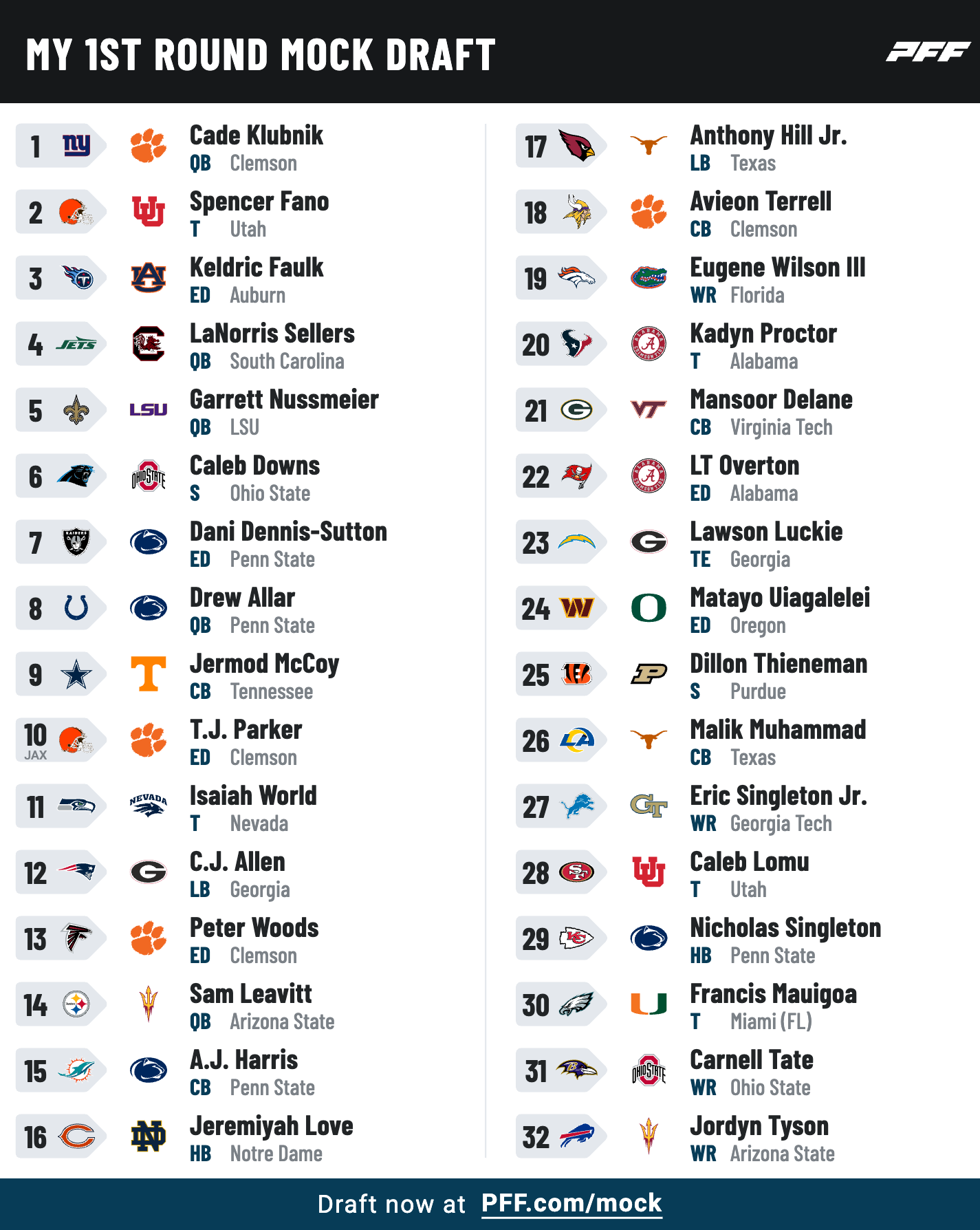 To have a little bit of fun, we ran through a 2026 NFL mock draft on the A to Z film room channel. Please excuse the PFF simulator for not having some of the transfer player’s schools correct. It appears the draft order was also based on betting odds to win the Super Bowl, so we ended up having two AFC teams playing for a championship. Apologies for that oddness at the very end.