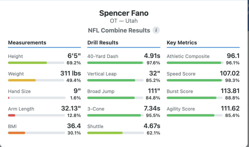 Spencer Fano’s measureables via A to Z Sports’ mock draft simulator.