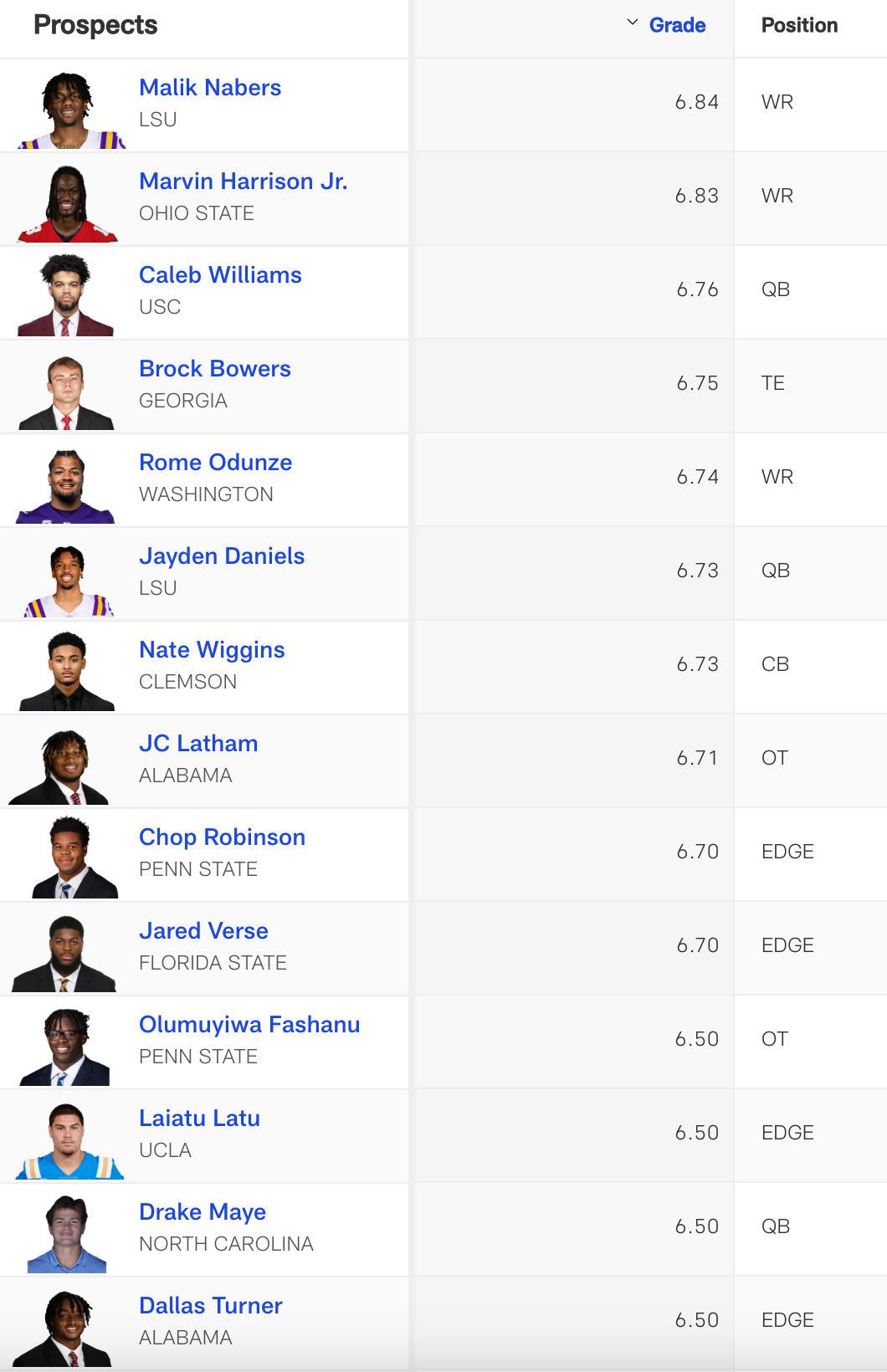 Also interesting to note that LSU's Jayden Daniels is rated higher than North Carolina quarterback Drake Maye.