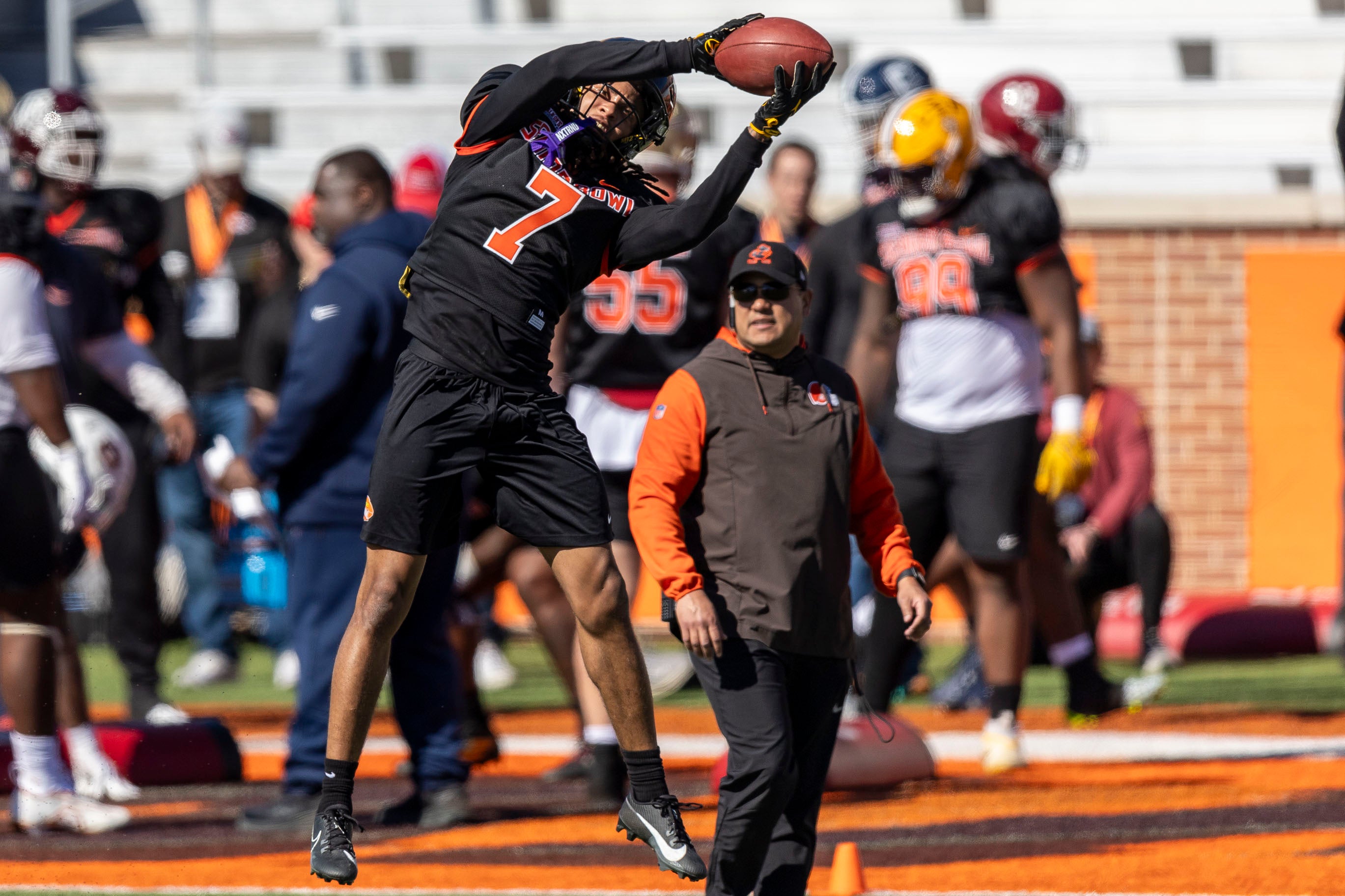 Both Payton Wilson and Cedric Gray racked up more than 200 tackles over the last two seasons. Both have 40+ starts at linebacker. And both played really well all week. Gray was always near the ball in practice, even if the play wasn't sent his direction. Wilson was the leader of the National team defense with the green dot on his helmet (with play-calling communications inside) and consistently made plays in pass coverage like this one where he reads the quarterback's eyes and defends the short pass.