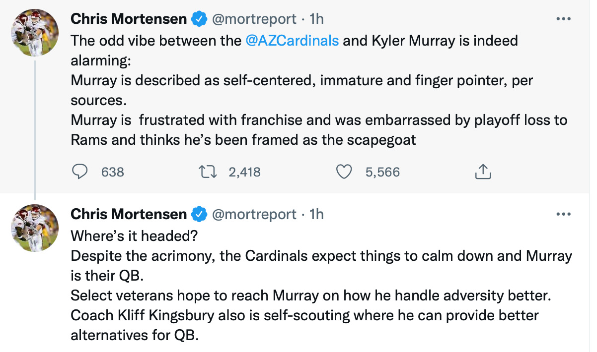 Mortensen reported that Murray is frustrated and embarrassed by the Cardinals' 34-11 loss to the Los Angeles Rams in the Wild Card round of the playoffs. Mortensen then said sources have told him that Murray is "self-centered" and "immature".