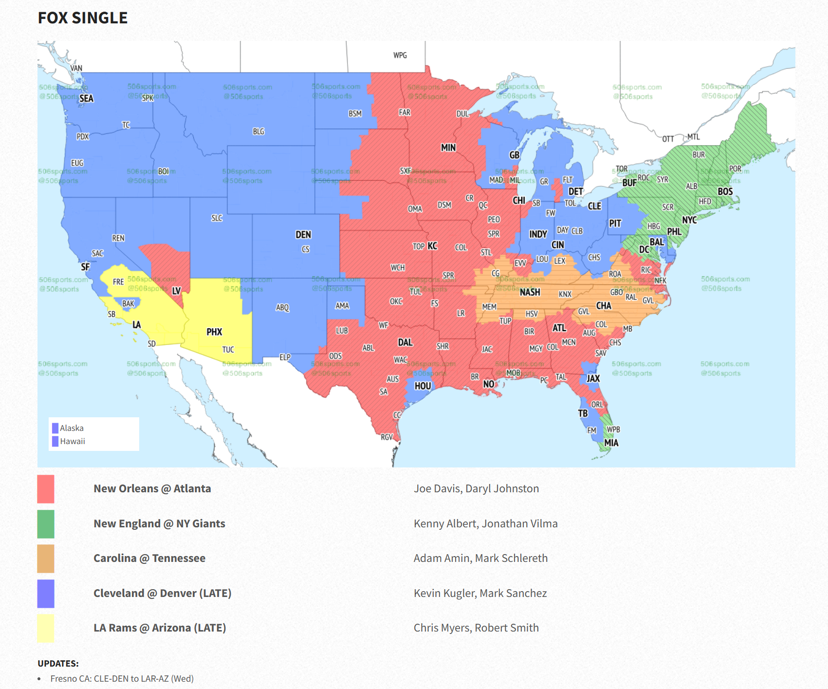 The game will only be seen throughout the state of Arizona, predictably, with the exception of the usual part of northeast Arizona that has been excluded for much of this year from Cardinals games. That area will receive Browns-Broncos instead as their local FOX game. The large majority of the country will split between Saints-Falcons and Browns-Broncos, with regional coverage for Patriots-Giants and Panthers-Titans.