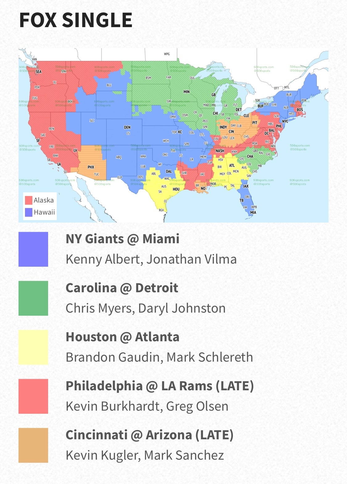 More of the country will see the Philadelphia Eagles and Los Angeles Rams in the late window on Fox. The majority of the country will see the Kansas City Chiefs at Minnesota Vikings on CBS.