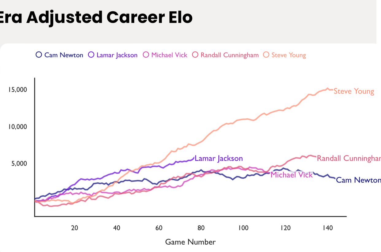 According to Adjusted Career Elo, a useful stat to fairly measure quarterback from different eras, Jackson is on a path to clearly surpass Newton as the more productive player.
