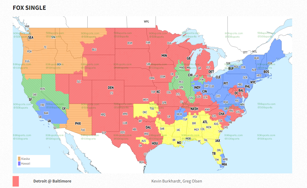 The red color on 506sports.com’s map above highlights the areas in which the local FOX station will air this matchup between the Ravens and the Lions. If you do not reside in any portion of the red color in this broadcast map, you can still watch the game via multiple streaming services, including NFL+ and YouTube TV.