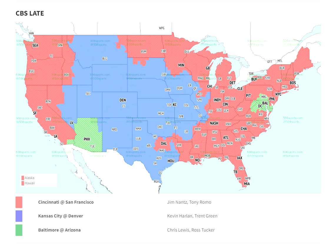 The green color on 506sports.com’s map above highlights the areas in which the local CBS station will air this contest between Baltimore and Arizona. If you do not reside in any portion of the green color in this broadcast map, you can still watch the game via multiple streaming services, including NFL+ and YouTube TV.