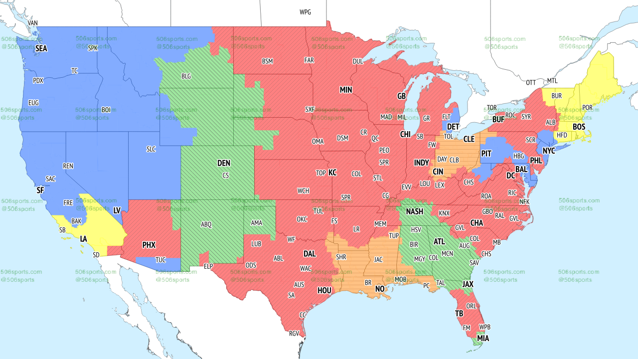 Based on the map above, the majority of the country will be viewing Bears and Packers game in the red area. Those inside the orange areas will be able to view the Cleveland Browns at New Orleans Saints game. The other early game on FOX will be the Los Angeles Rams at New England Patriots game in the yellow areas.