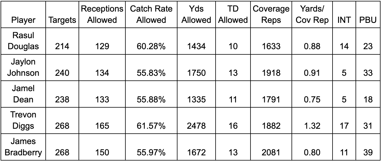 Douglas’ camp might argue he deserves a stronger valuation than Bradberry because of the additional four interceptions, but the extra 17 PBU’s, lower catch rate and lower yards allowed per coverage rep for Bradberry evens the playing field. Douglas will likely benefit from the added salary cap this year, as Bradberry’s 5.63% cap share in 2023 would set Douglas up at $14.39 million per year, which looks like a substantial raise over Dean and Bradberry.